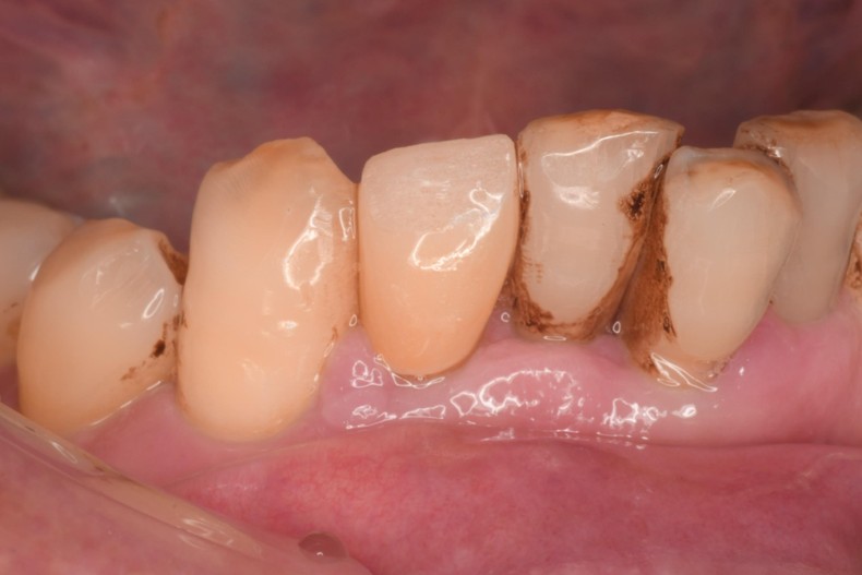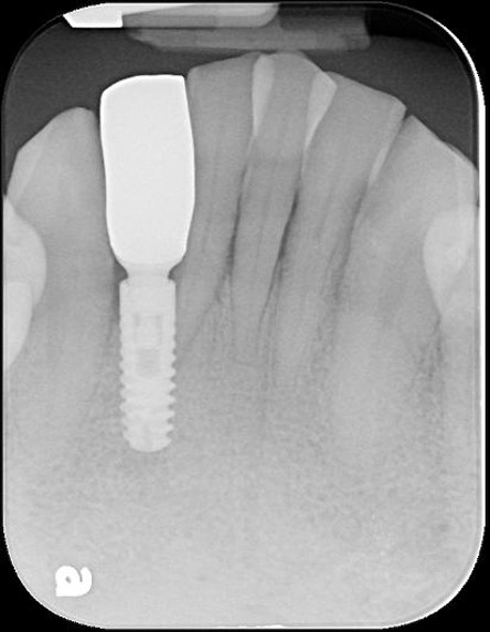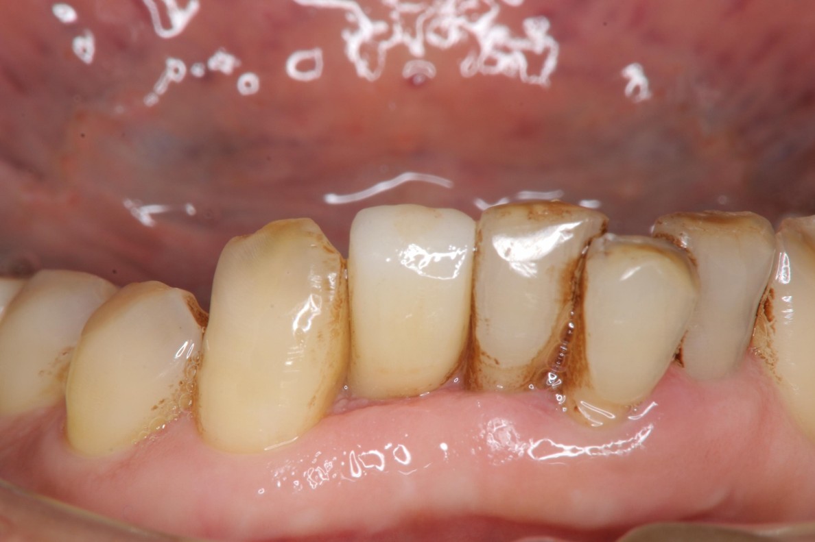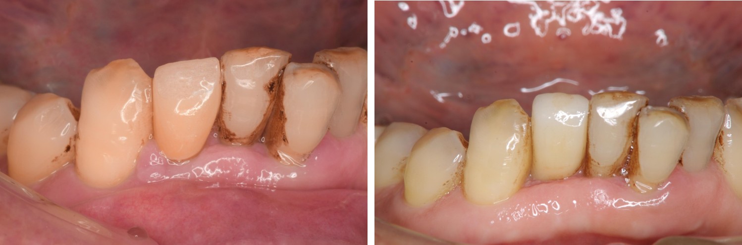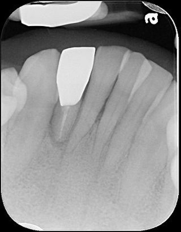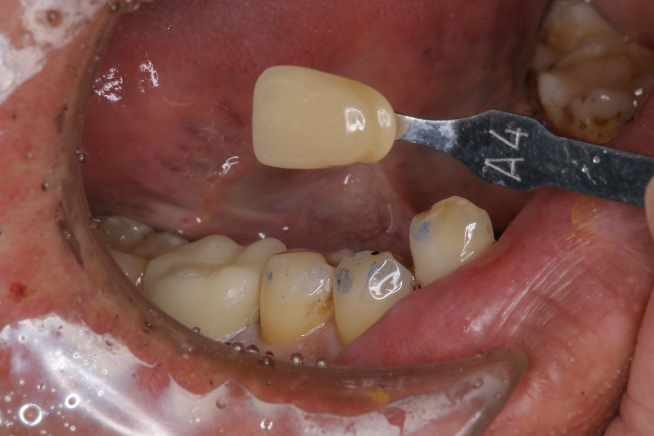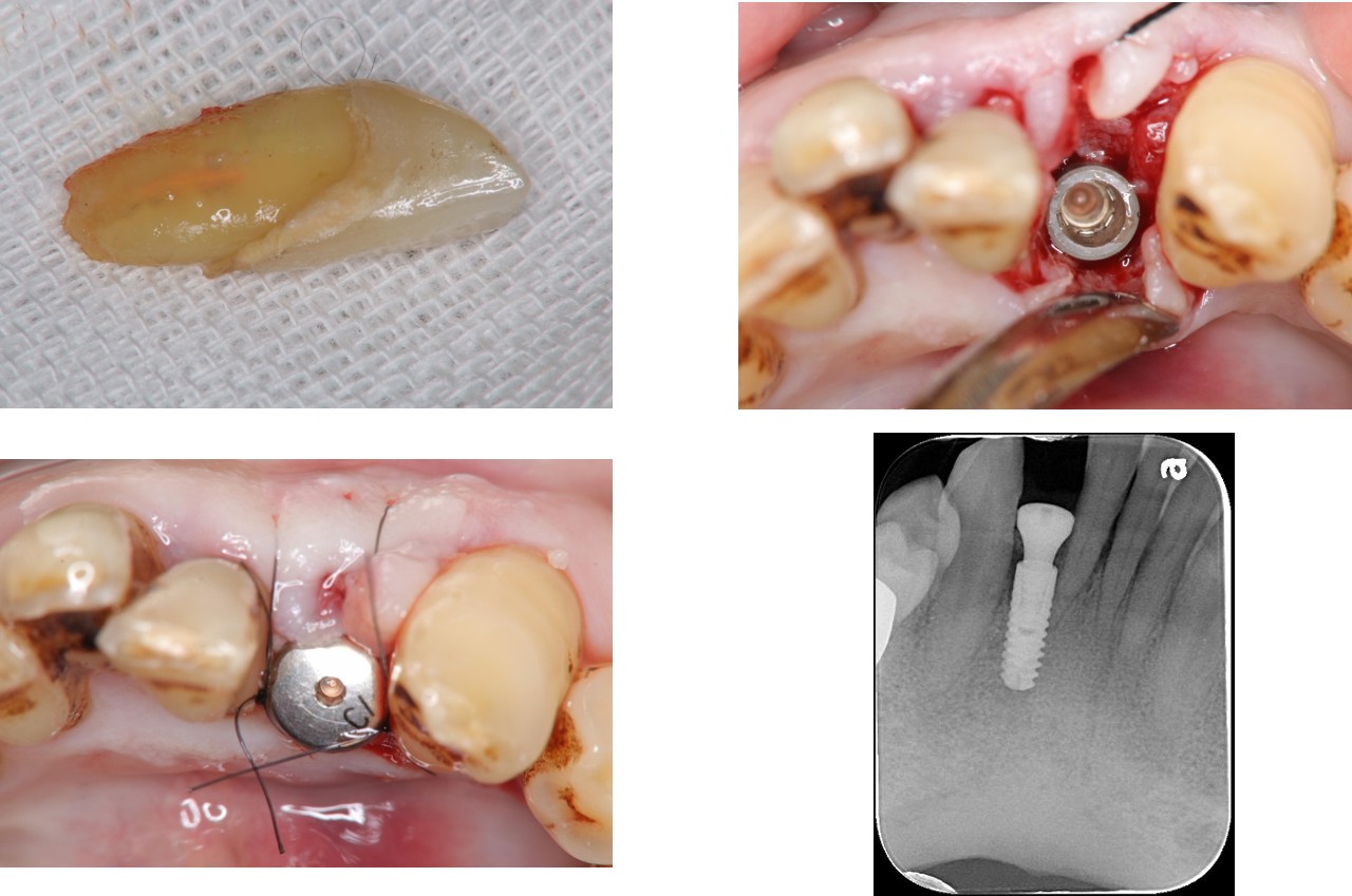 本病患為嚴重蛀牙,導致牙齒斷裂,經評估,骨頭良好,因此可拔牙後立即植牙,減少等待時間,待植體癒合後,再進行膺復處置