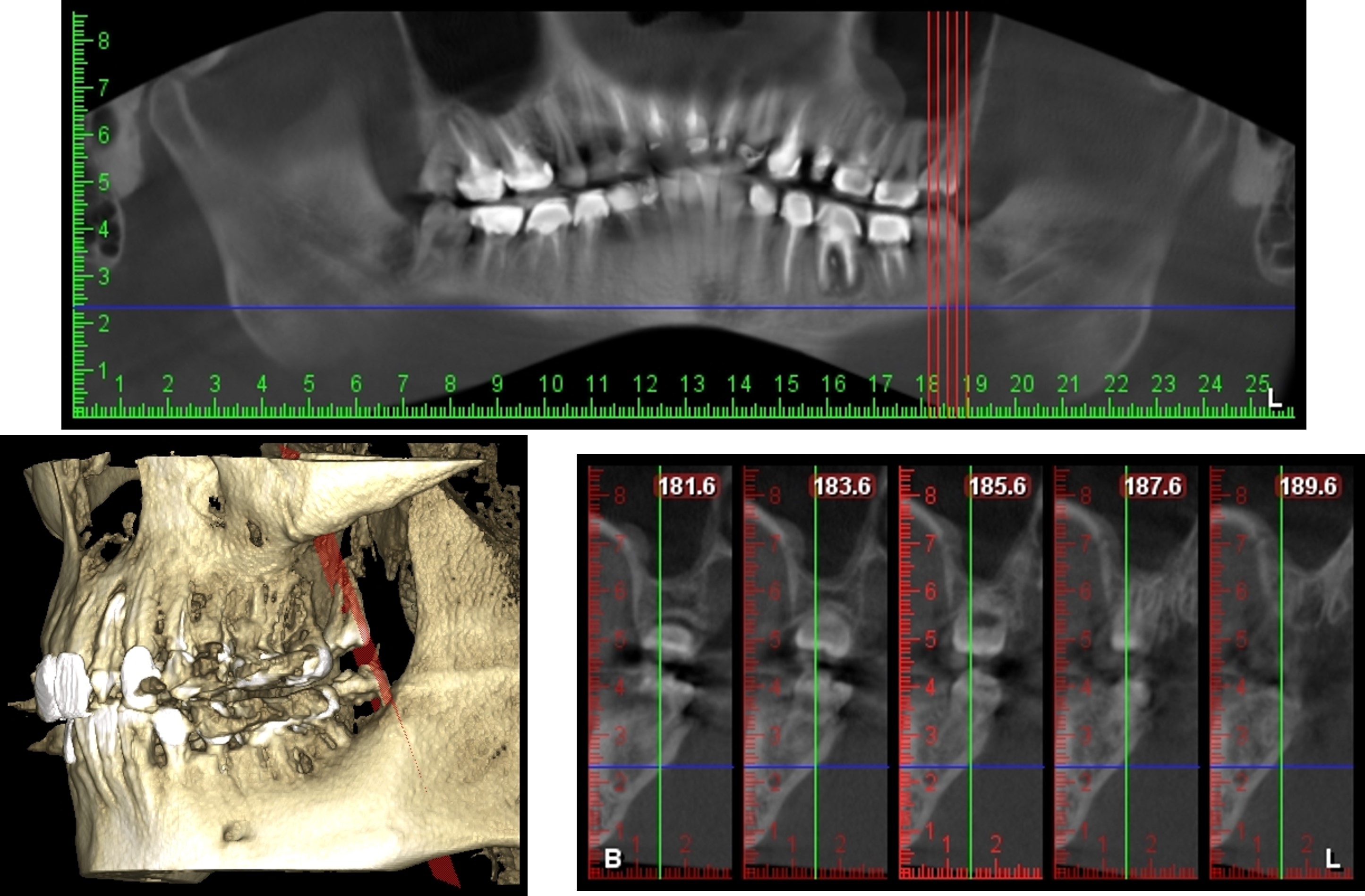 牙科專用的3D電腦斷層攝影;與傳統醫療電腦斷層相比較,輻射劑量只有一般電腦斷層的1/50;切片厚度一般醫療電腦斷層是2.0公厘,牙科3D電腦斷層則只有0.1公厘,就診當天馬上拍攝電腦斷層,馬上獲得立體影像。
