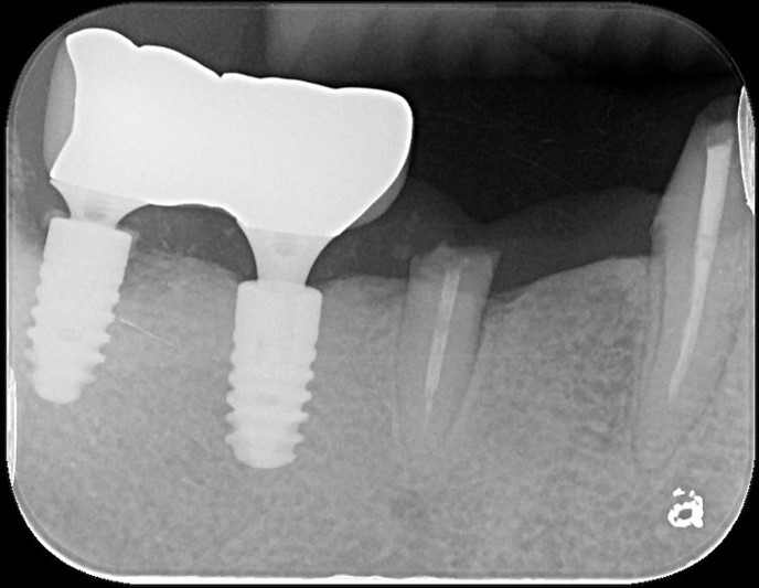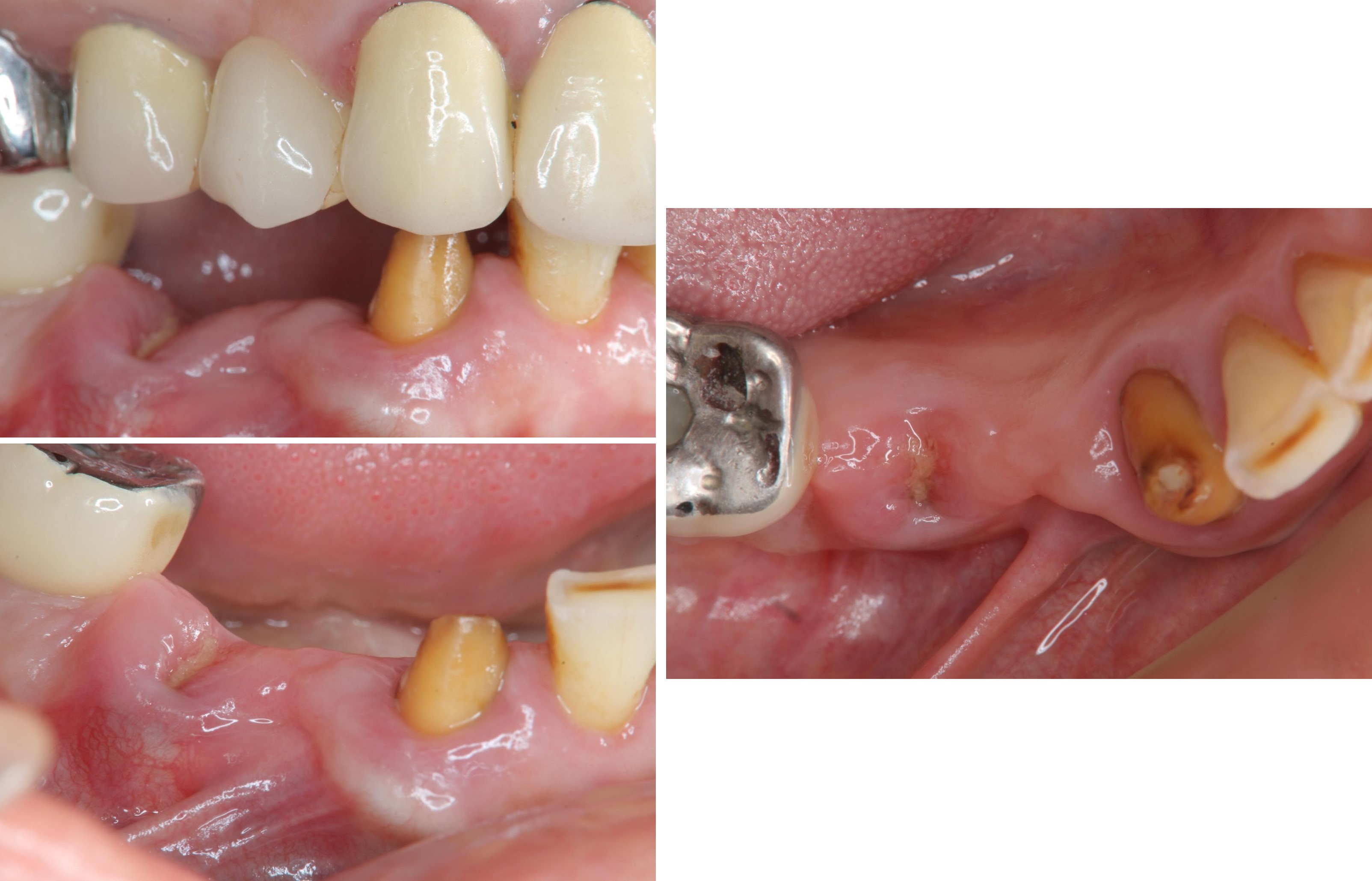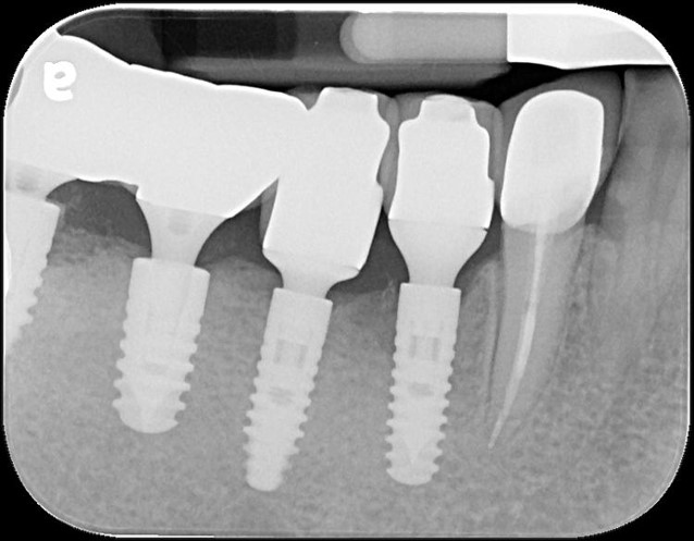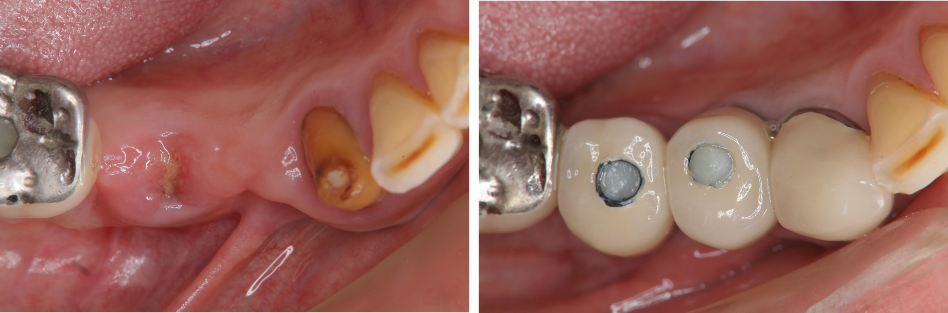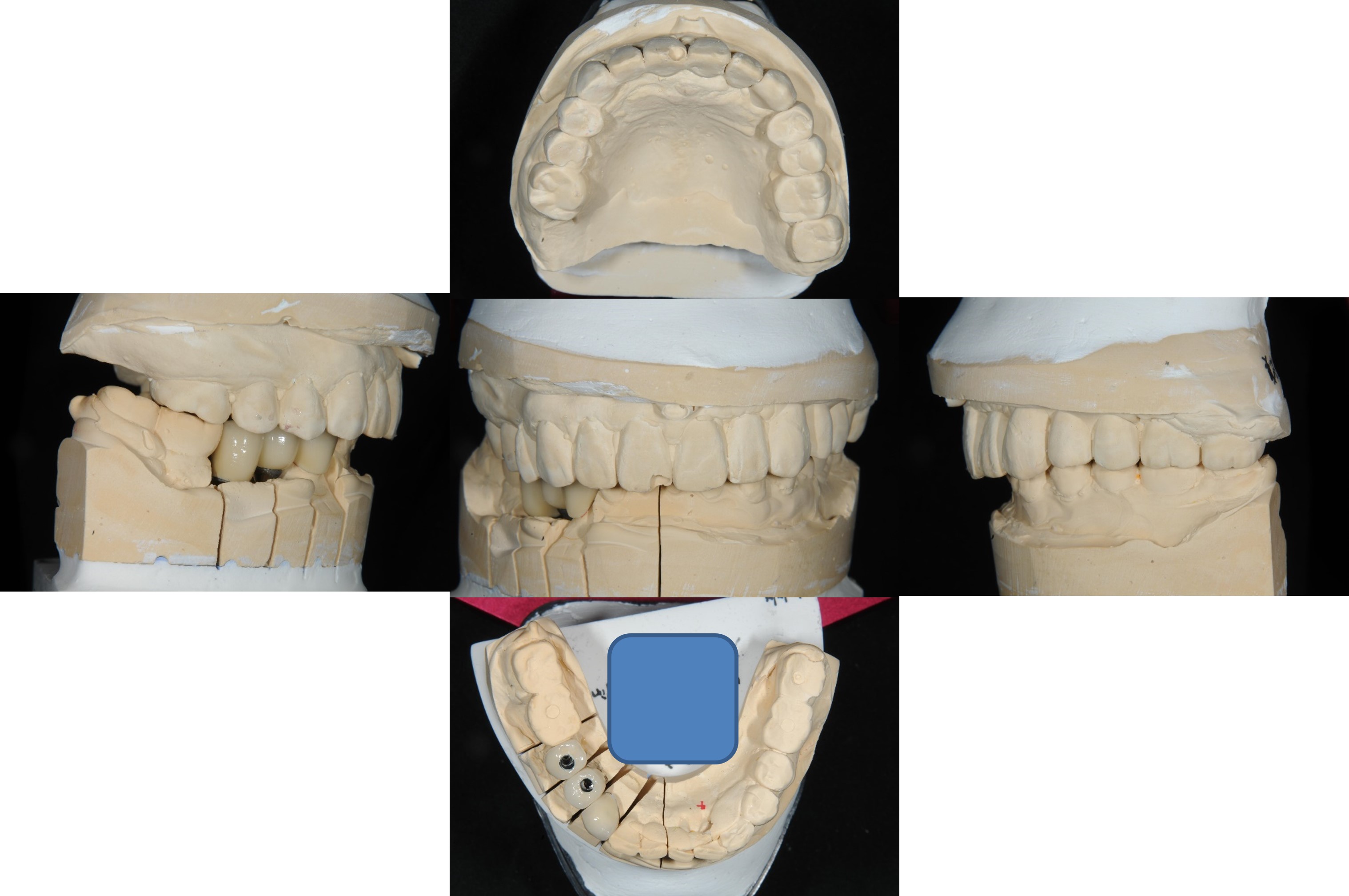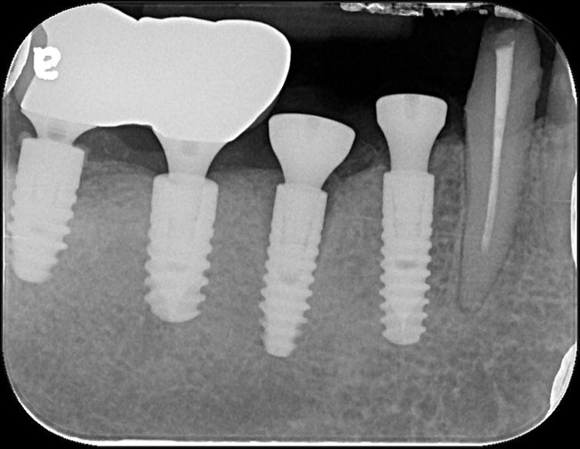 患者因不密合假牙,合併牙周破壞,無法保留牙齒,因費用考量,採植牙牙橋與金屬燒付瓷牙
