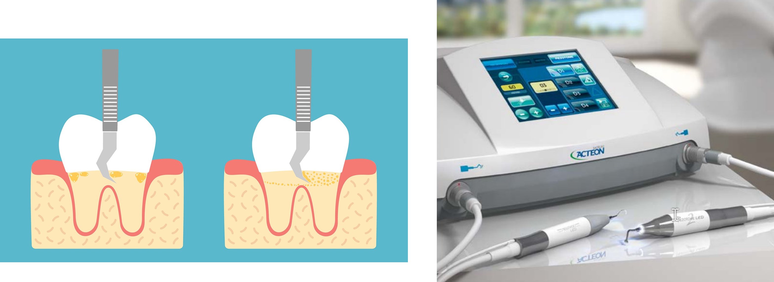 部分診所會結合水雷射技術,溫和無痛地深度清潔牙齦下的發炎組織,同時具備殺菌和止血效果。