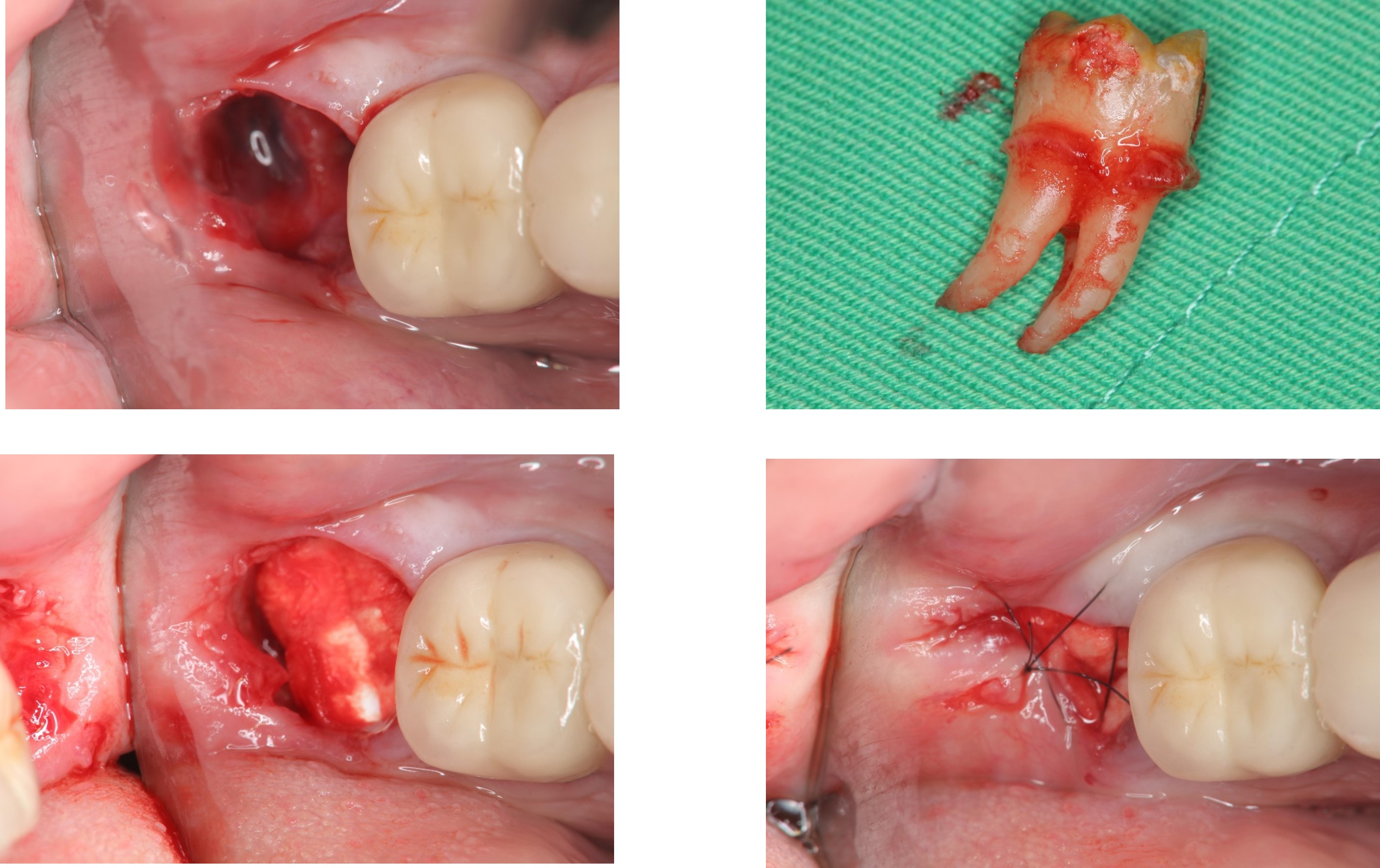 使用骨質增生膠原蛋白,來處理拔牙後的傷口。此材料適用的範圍不僅用於拔牙後傷口,所有顎骨中的病灶於手術後皆建議使用。