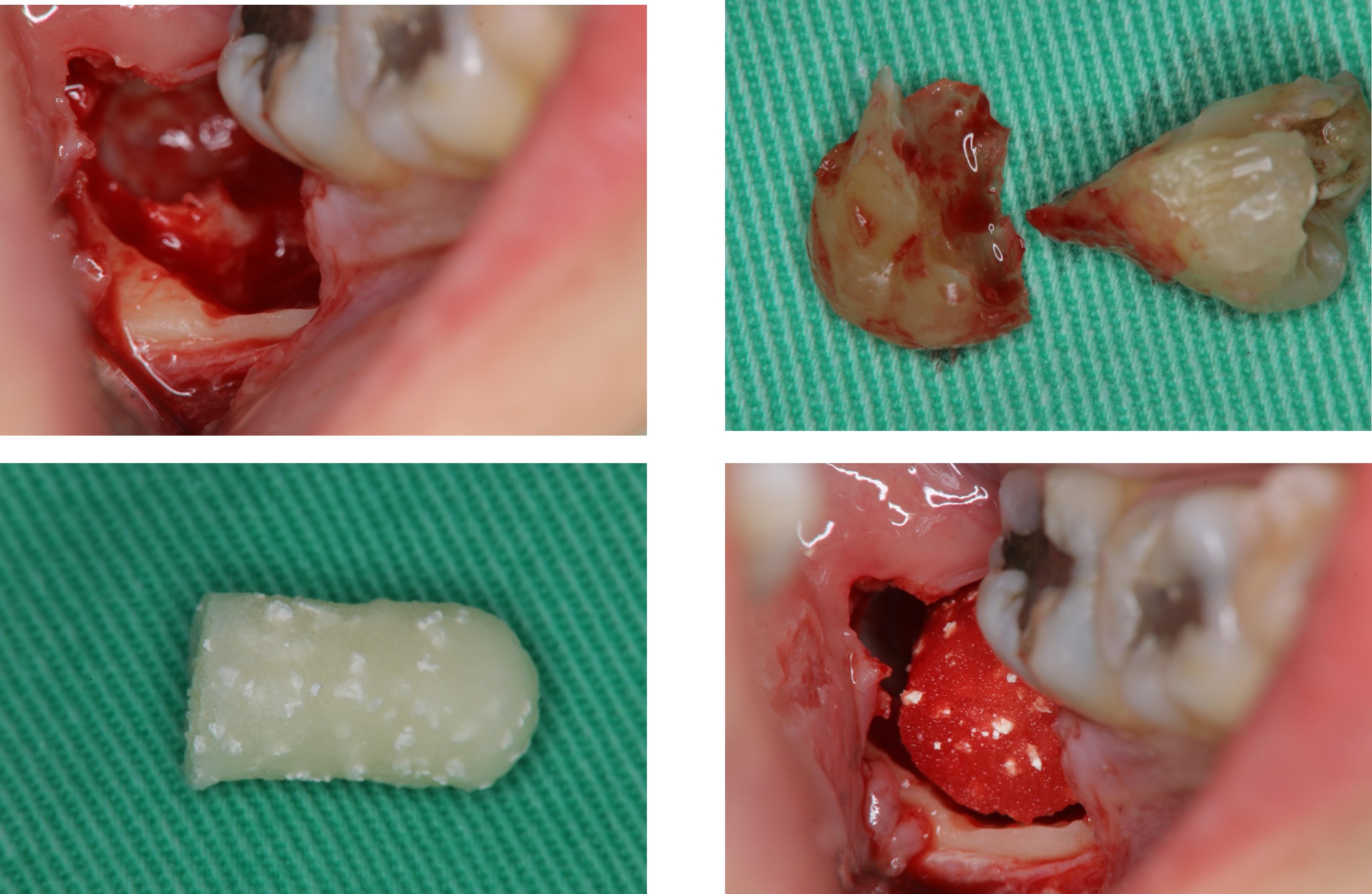 使用骨質增生膠原蛋白,來處理拔牙後的傷口。此材料適用的範圍不僅用於拔牙後傷口,所有顎骨中的病灶於手術後皆建議使用。
