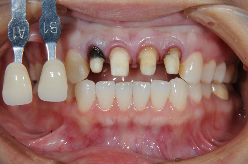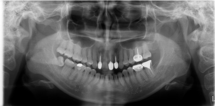 上顎前牙有瘻管,牙齒變色,右下有阻生齒與蛀牙