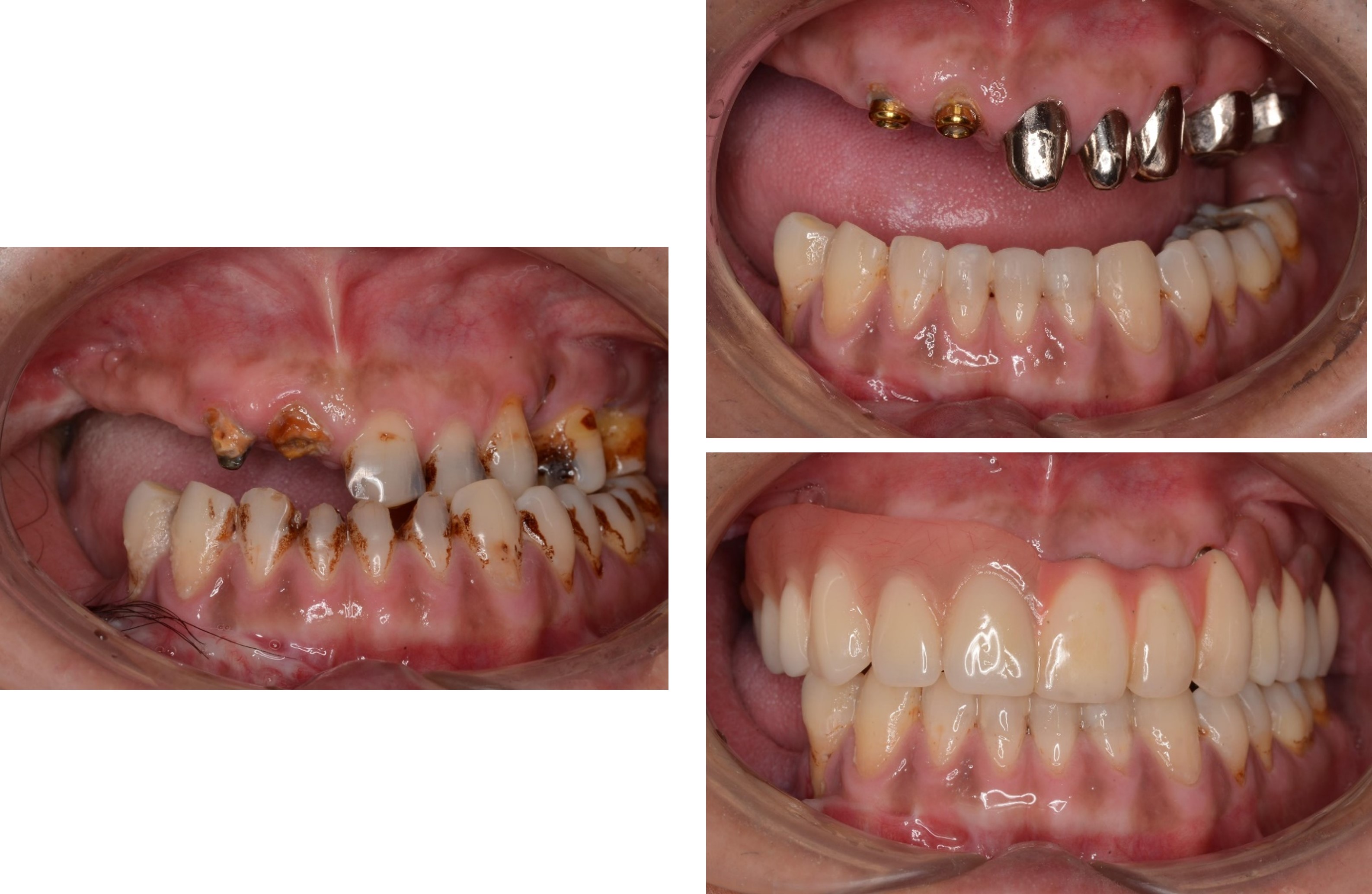 口腔重建是指重建與恢復口腔的健康及穩定的咬合能力,這其中包括對牙齒、牙周組織、咀嚼肌群、顳顎關節及美觀等做整體性的評估,依評估的結果,以恢復穩定咬合、提昇美觀等目標做整體治療。什麼人需要全口復健?當口內缺牙太多、牙齒咬合高度喪失,導致咬合不穩定,或是牙周病很嚴重,導致齒槽骨的破壞、咬合崩塌,這些情況必須全口重新建立上下支撐,恢復穩定的咬合關係。穩定的咬合關係,必須仔細考量中心咬合位及中心關係,如果兩者關係不安定(>0.5-1 mm)就容易造成顳額關節適應性障礙,如頭頸部疼痛、下巴張不開或易脫滑、顳顎關節卡卡聲等。所以要達到口腔重建的目標,我們必須了解求診者的主訴,醫師蒐集臨床上的口內外相片、X光、牙齒、牙周、顎關節肌肉、美觀等檢查資料,和各科醫師群做綜合診斷整體治療之計畫分析、評估、治療方案等考量形成治療計畫,再與患者做充分的溝通,在專任管理師協助流程控管,才可能達到最穩定理想的治療結果。